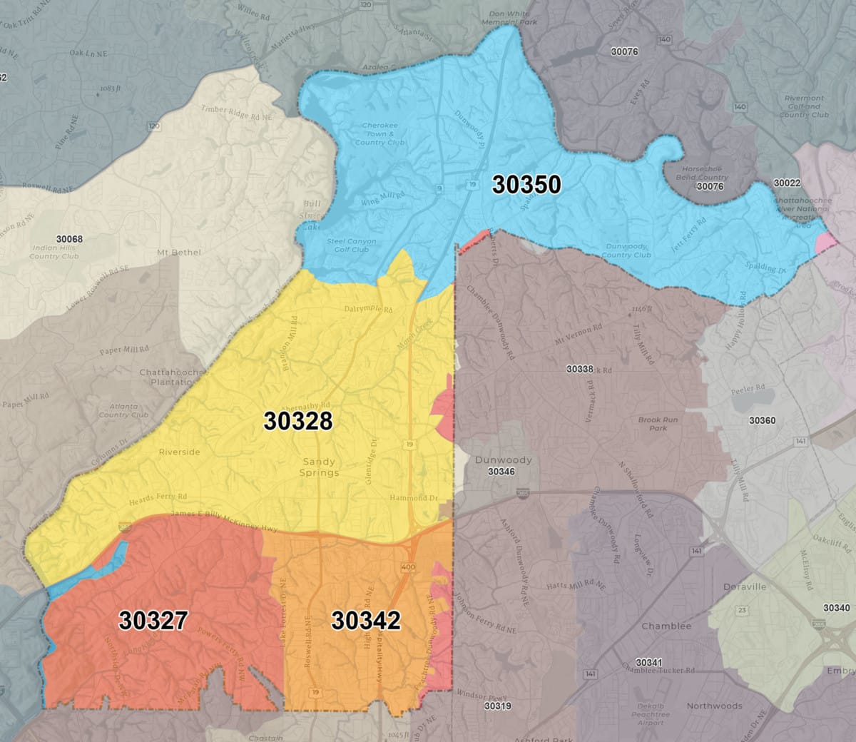 The northern section of 30328 contains large residential areas.